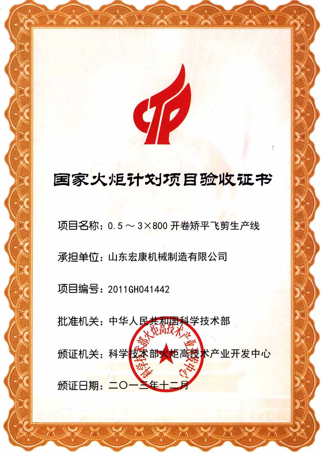 國家火炬計(jì)劃項(xiàng)目驗(yàn)收證書