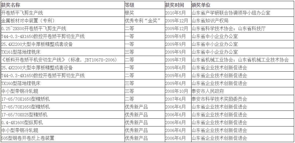 “25.4×2200大型中厚板精剪成套設(shè)備”榮獲中國機械工業(yè)科技進步二等獎和山東省科技進步二等獎,并被認定為國家重點新產(chǎn)品;